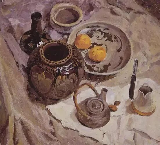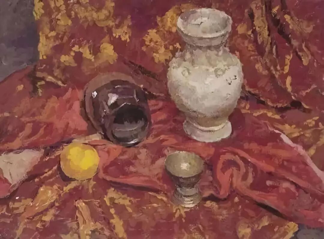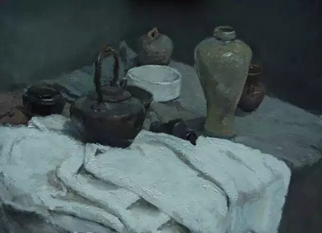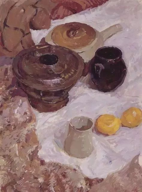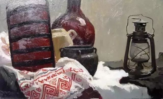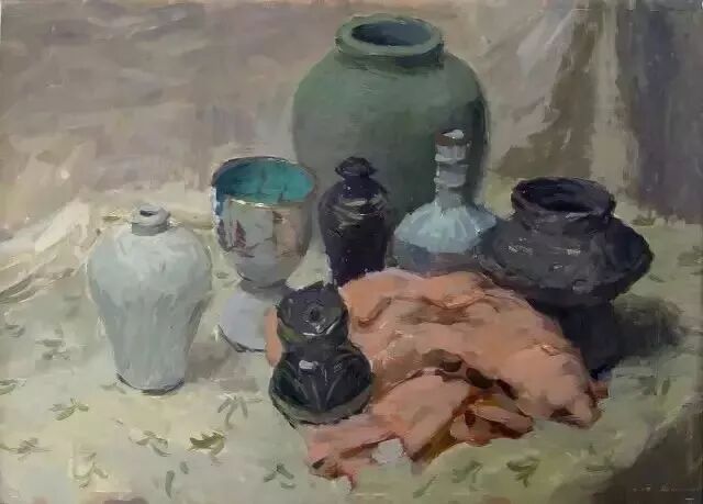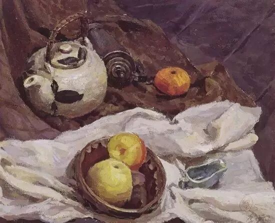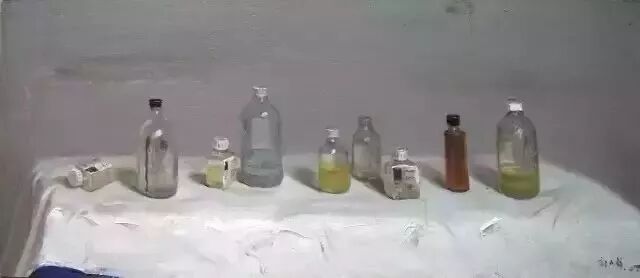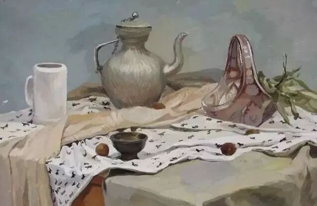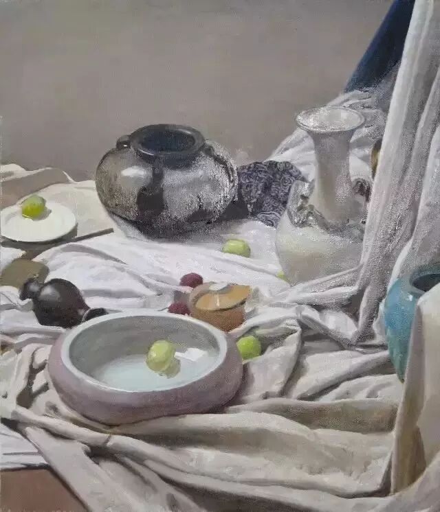 图中罐子是黑色的,衬布为白色,果子与玻璃杯为灰色,黑白灰明确,这是从明度对比关系上分析。从纯度来讲,杯子最高,果子次之,罐子与白布较弱,纯度关系分明。从色相上讲,杯子为黄色,果子为绿色,罐子为黑色,衬布为白色,色相一目了然。